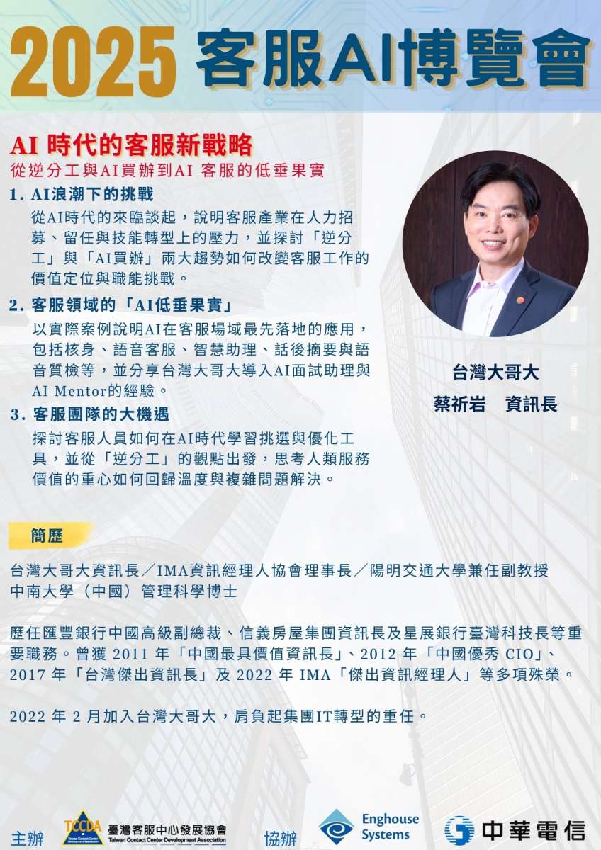 13:50 | - | 14:20 | AI 時代的客服新戰略:從「逆分工」與「AI 買辦」到AI 客服的低垂果實 | 台灣大哥大 蔡祈岩 資訊長 |