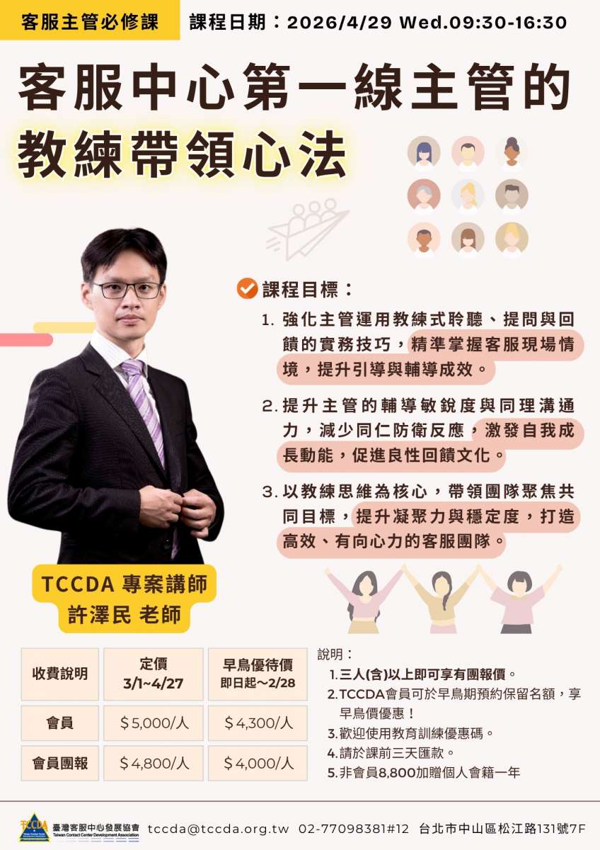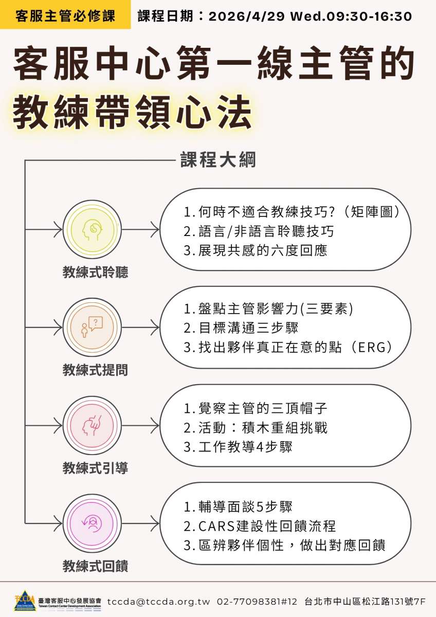 【培訓課】2026/04/29 客服中心第一線主管的教練帶領心法
