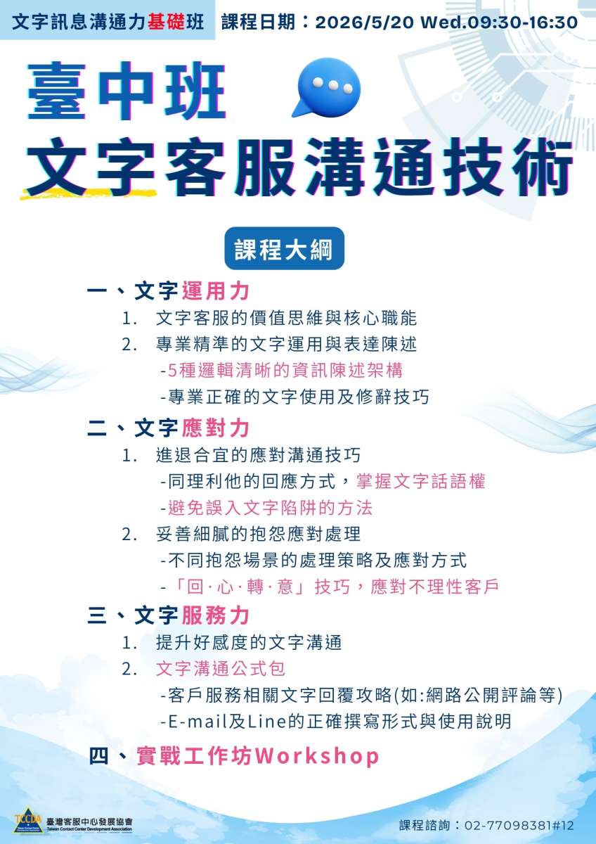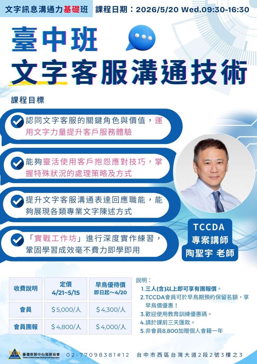 【培訓課】2026/05/20【台中班】文字客服溝通技術