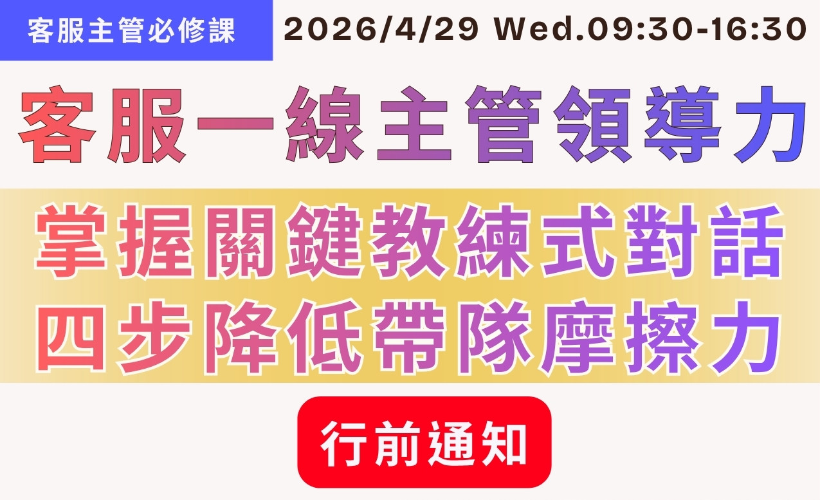 行前通知【培訓課】2026/04/29 客服一線主管領導力:掌握關鍵教練式對話 四步降低帶隊摩擦力