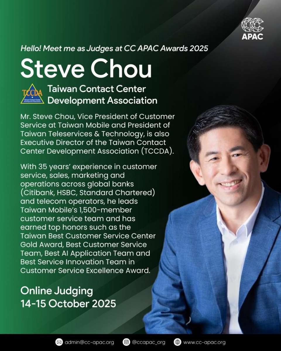 A prominent leader with 35 years of experience (global banks and telecom), Mr. Steve Chou is the VP of Customer Service at Taiwan Mobile and President of Taiwan Teleservices & Technology. He also holds the Executive Director role at the TCCDA. Under his leadership, Taiwan Mobile has won major awards, including the Taiwan Best Customer Service Center Gold Award and numerous accolades for Best Team (AI Application, Service Innovation).