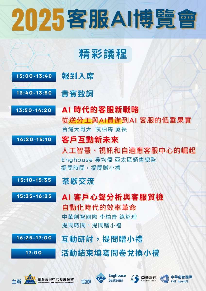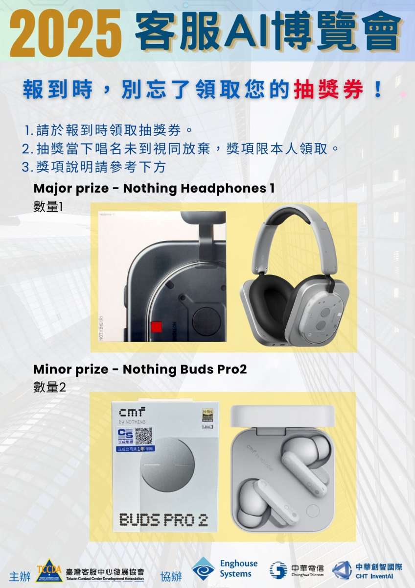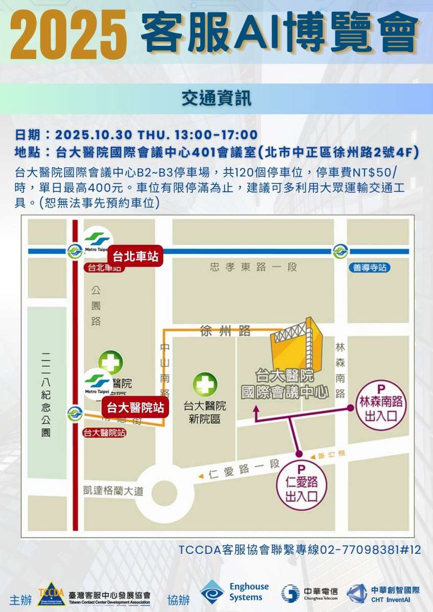 報到時,別忘了領取您的抽獎券!報到時間13:00-13:40日期:2025/10/30 (四) 13:00–17:00主題:2025 客服AI博覽會地點:台大國際會議中心 401 廳(台北市中正區徐州路 2 號 4 F)Google Map:https://share.google/Pn8Lqm60qOD0zKTEx