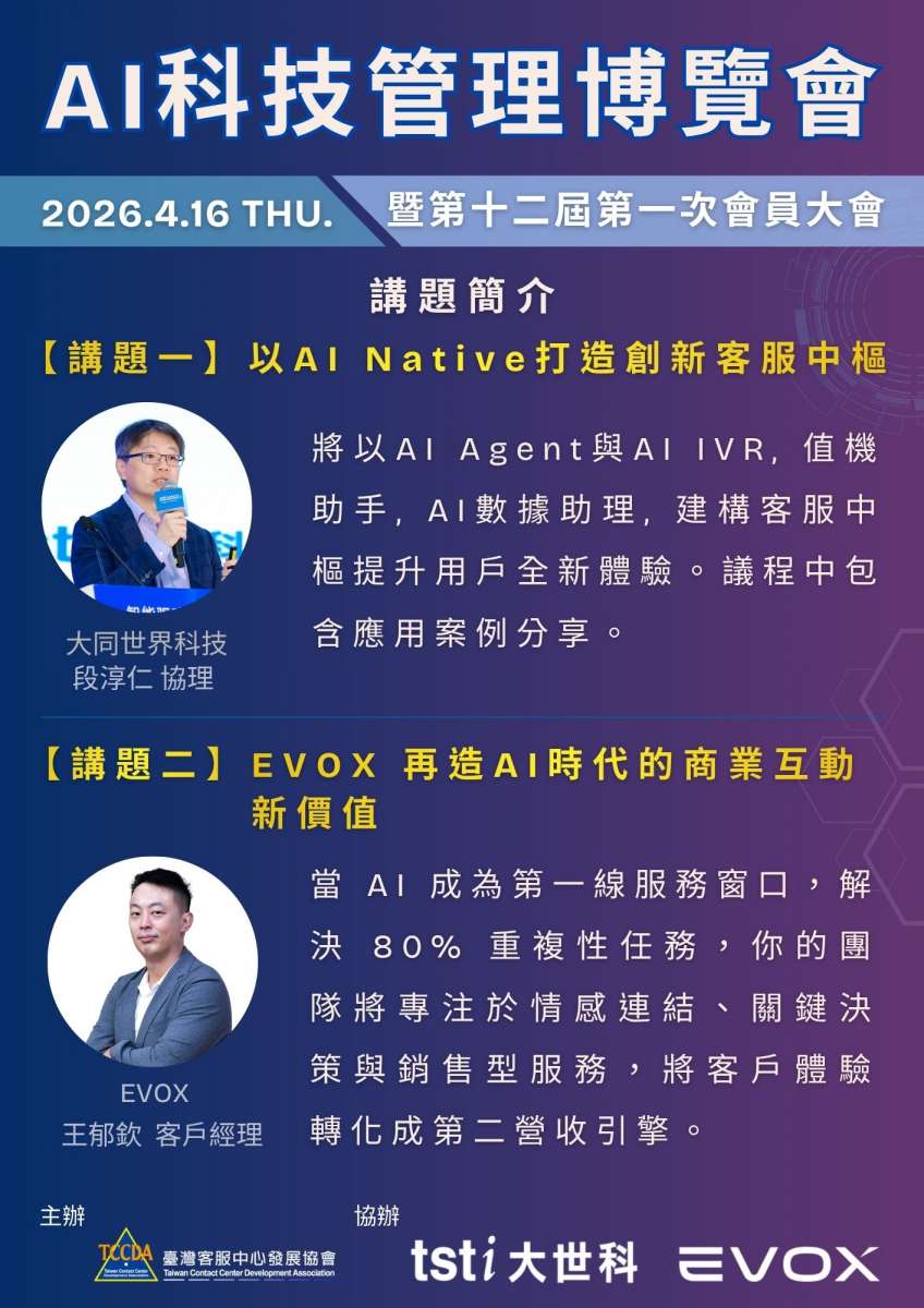 今年首場研討會登場!匯聚產業專家,透過趨勢分享、實務案例與交流互動,帶您全面掌握AI於管理與客服領域的最新應用與發展方向!