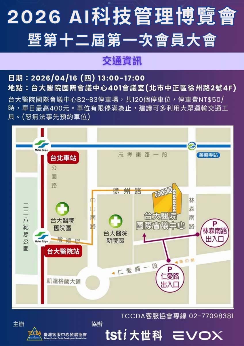地點:台大國際會議中心 401 廳(台北市中正區徐州路 2 號 4 F)停車資訊:會議中心B2~B3停車場共120個停車位,每小時NGoogle Map:https://share.google/Pn8Lqm60qOD0zKTEx T$50,單日最高NT$400。車位有限停滿為止,建議可多利 用大眾運輸交通工具。恕無法事先預約車位。