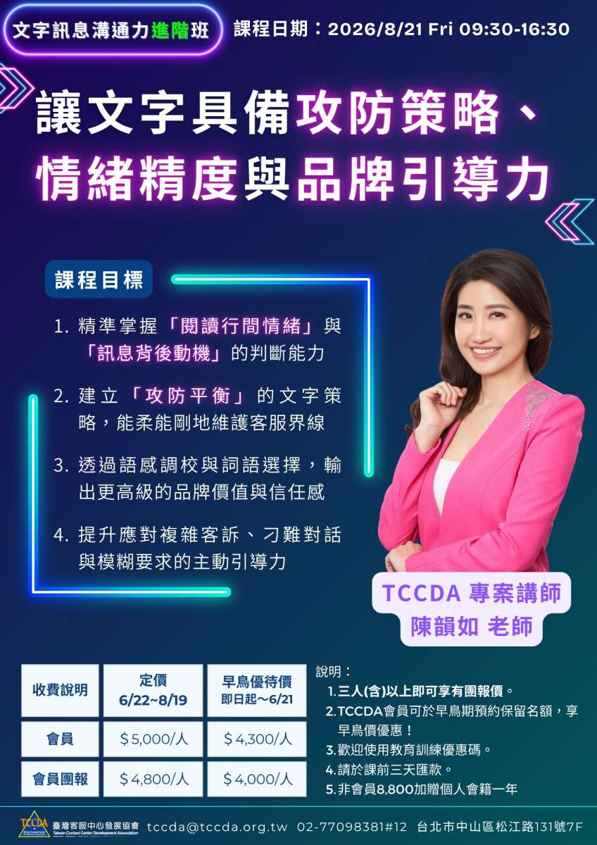 【培訓課】2026/08/21 文字訊息溝通力進階班:讓文字具備攻防策略、情緒精度與品牌引導力