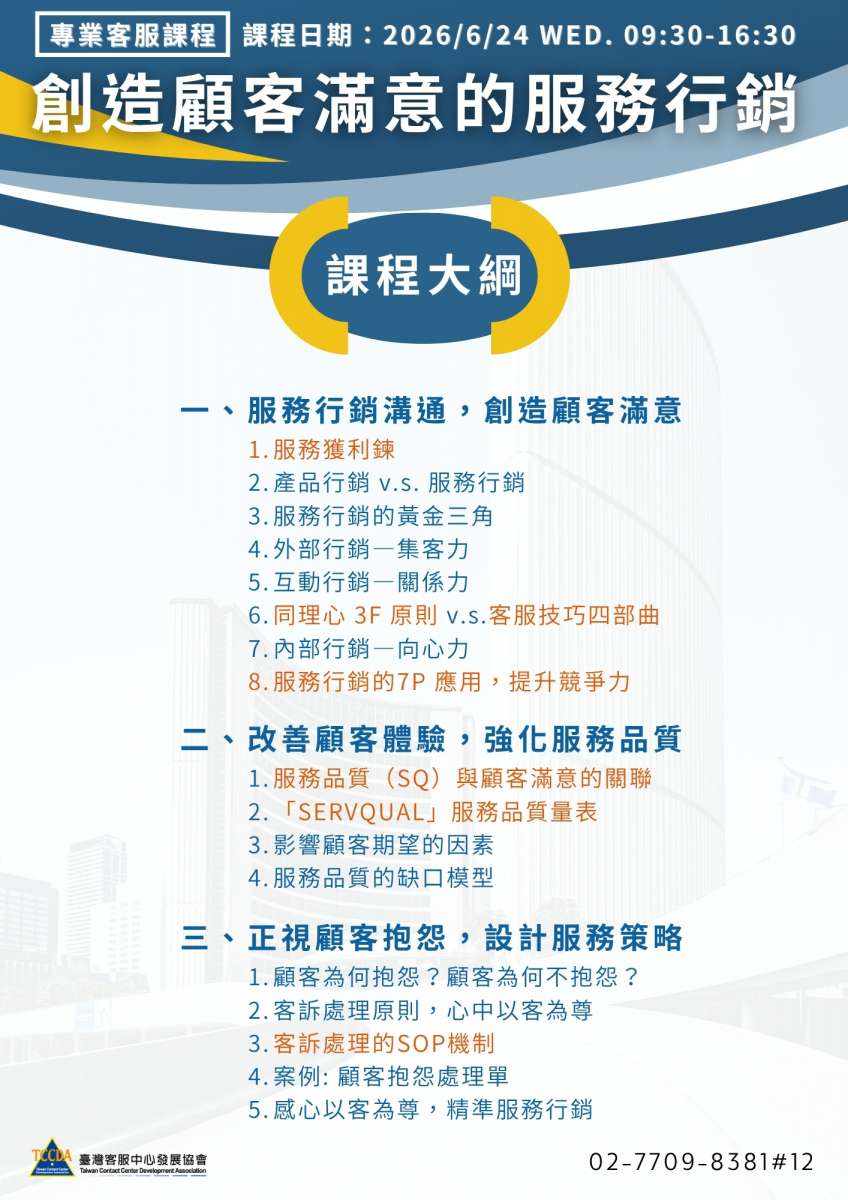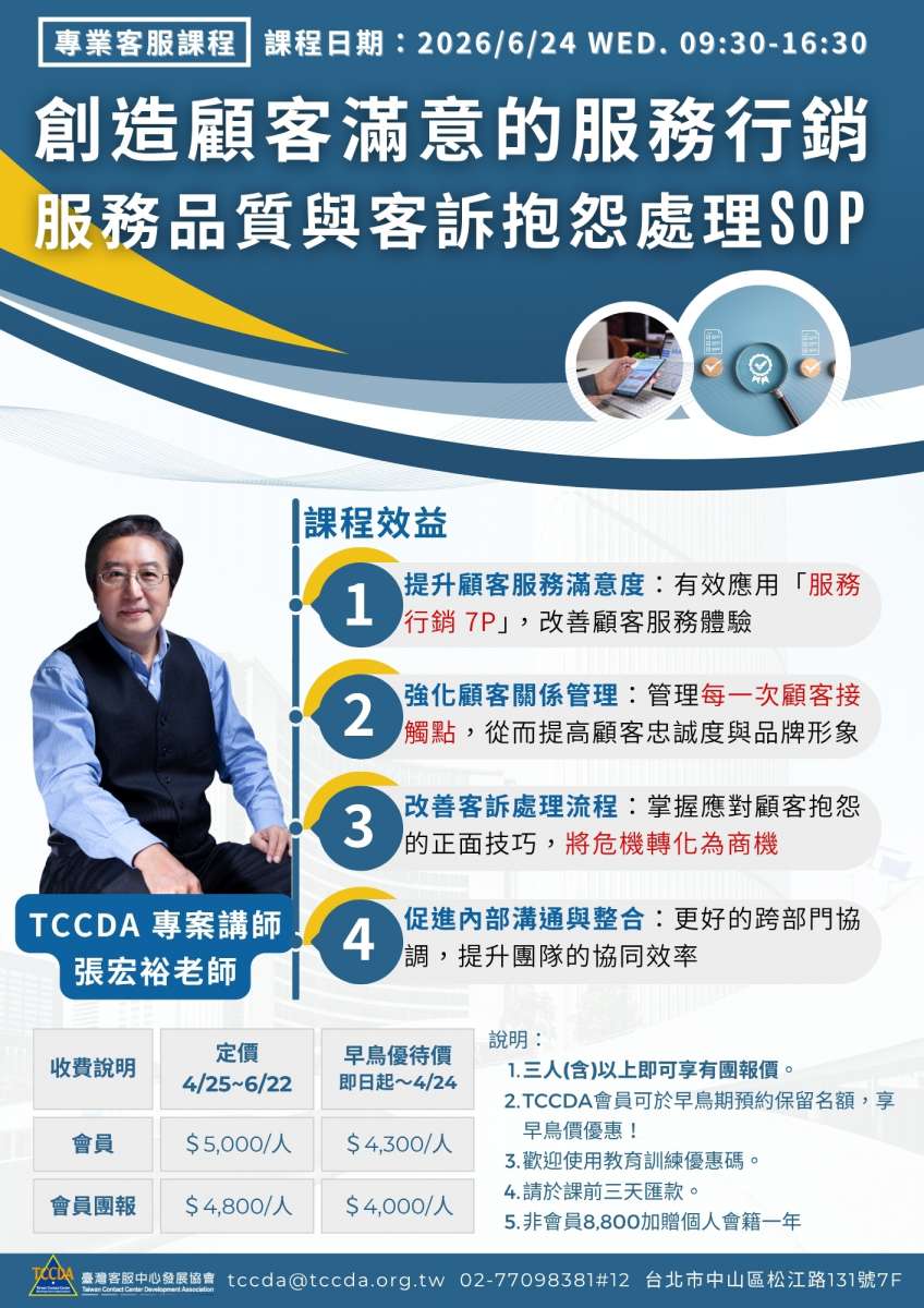 【培訓課】2026/06/24 創造顧客滿意的服務行銷-服務品質與客訴抱怨處理SOP