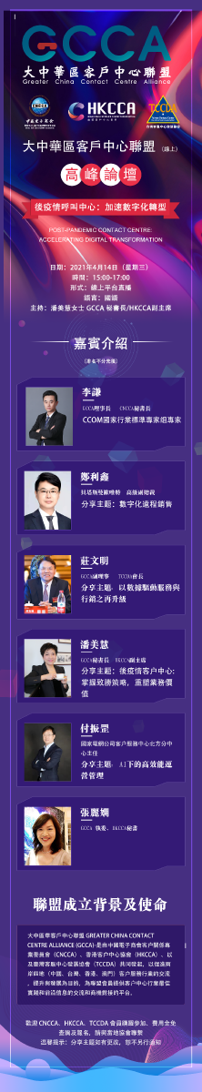 本次線上論壇邀请了GCCA會員專家,圍繞呼叫中心数字化轉型,在WFH模式、CCaaS、線上服務及購物方式、大數據應用、以及服務創新實驗等方面分享經驗心得,为後疫情呼叫中心重新出發助力加速。