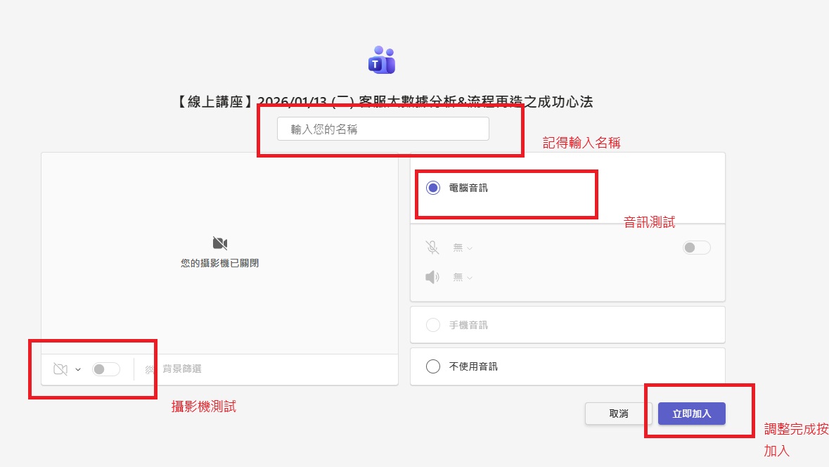 講座將採用 Microsoft Teams 線上進行,請依照以下步驟準備與參加,以確保順利進入會議並測試音訊: